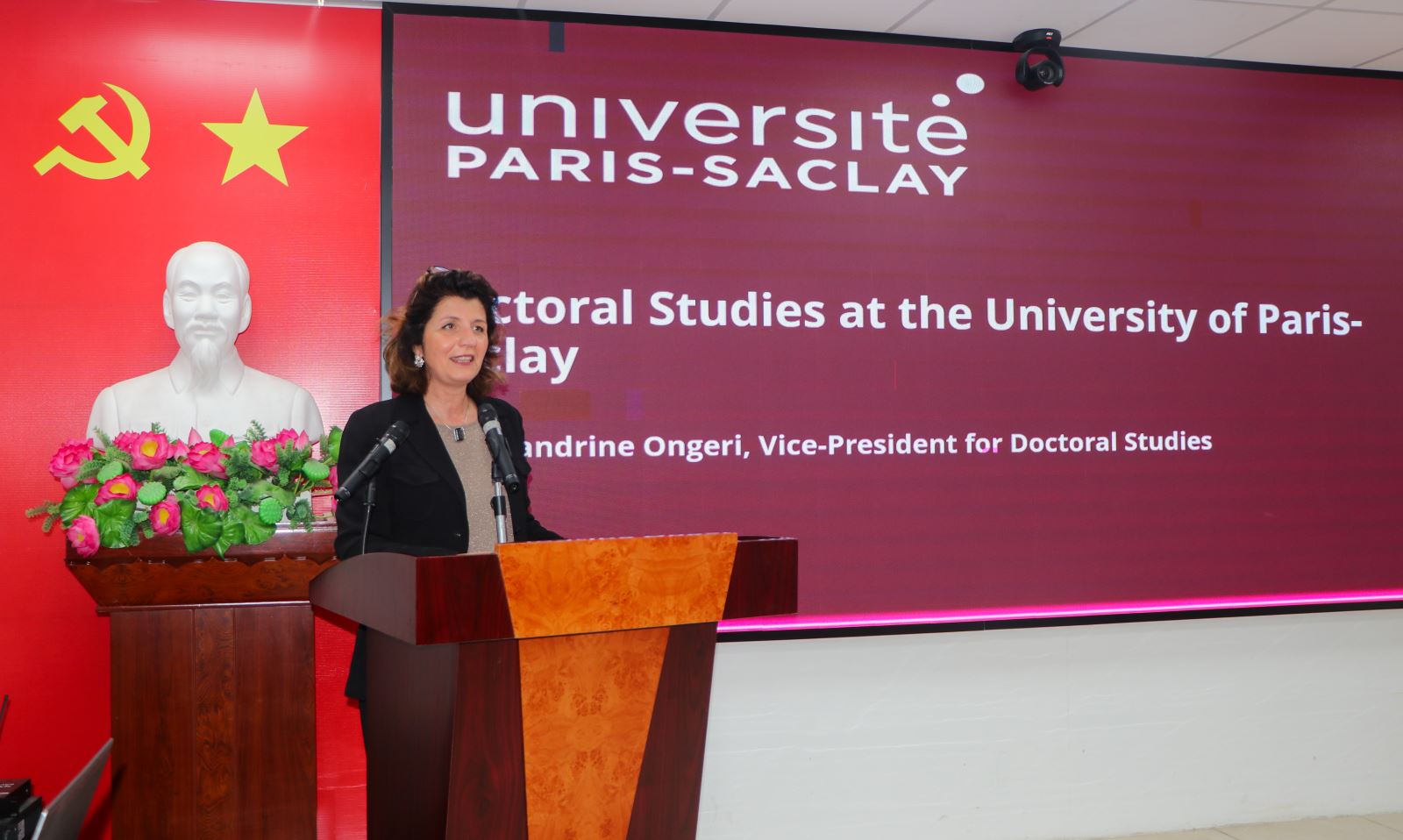 GS. Sandrine Ongeri – Phó Chủ tịch phụ trách đào tạo tiến sĩ đã giới thiệu về những thành tựu và con số nổi bật của Đại học Paris-Saclay. Hiện nay, Đại học Paris-Saclay đứng thứ 13 trong bảng xếp hạng các trường đại học tốt nhất thế giới với nhiều lĩnh vực đào tạo nằm trong top hàng đầu thế giới như Toán, Vật lí, Sinh thái học… Trường sở hữu mạng lưới 220 phòng thí nghiệm, 550 nền tảng thực nghiệm với hơn 13 nghìn công bố quốc tế mỗi năm, chiếm 13% trong tổng số công bố khoa học của Pháp. Bà cũng giới thiệu về hoạt động nghiên cứu tại viện BioCIS và thông tin chương trình đào tạo thạc sĩ, tiến sĩ tại Paris Saclay.