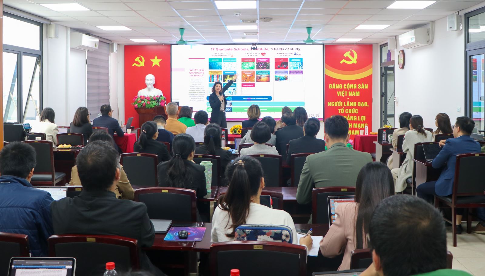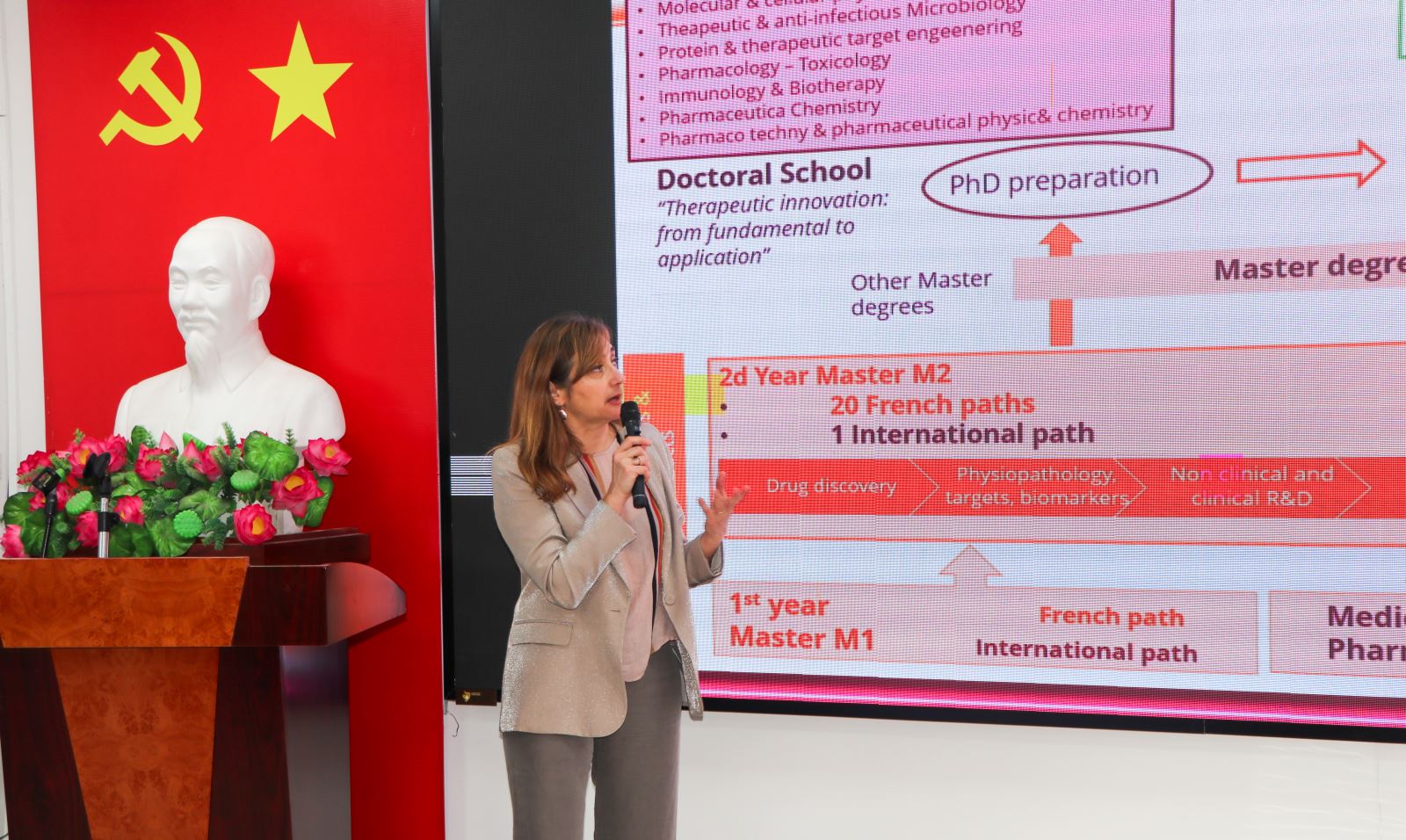 GS. Sandrine Ongeri - Phó Giám đốc UPS phụ trách Đào tạo Tiến sĩ; Giám đốc chương trình đào tạo tiến sĩ “Đổi mới trong điều trị: từ nghiên cứu cơ bản tới ứng dụng” giới thiệu về chương trình đào tạo sau đại học