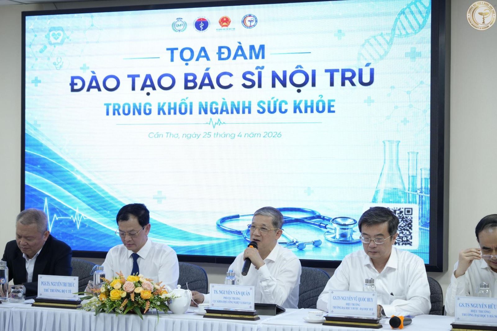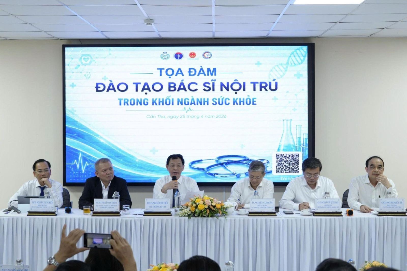 Ngày 25/4/2026, tại TP Cần Thơ, Trường Đại học Y Dược, Đại học Quốc gia Hà Nội (ĐHQGHN) phối hợp với Trường Đại học Y Dược Cần Thơ tổ chức Tọa đàm “Đào tạo Bác sĩ Nội trú trong khối ngành sức khỏe”. Chương trình có sự tham dự của PGS.TS. Nguyễn Tri Thức, Thứ trưởng Bộ Y tế, cùng hơn 100 đại biểu là lãnh đạo các cơ sở đào tạo, Sở Y tế và bệnh viện Trung ương, địa phương trên cả nước.