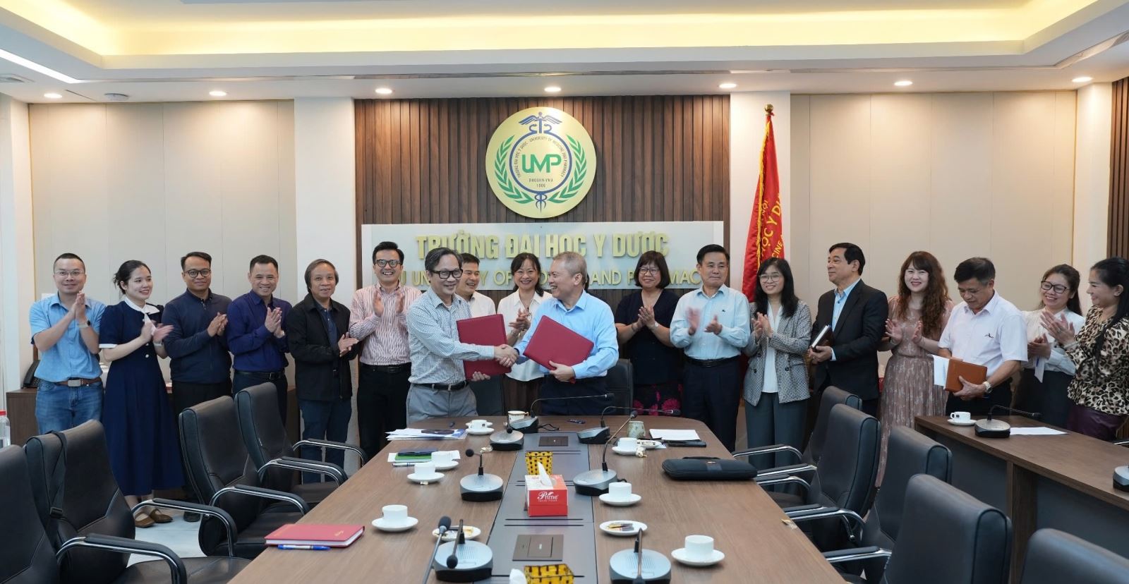 GS.TS.TTND. Lê Ngọc Thành, Hiệu trưởng ký và trao Biên bản giao nhiệm vụ cho GS.TS. Nguyễn Thanh Hải, Phó Hiệu trưởng kiêm Trưởng khoa Dược, Trưởng đoàn cán bộ công tác tại Đại học Paris Saclay